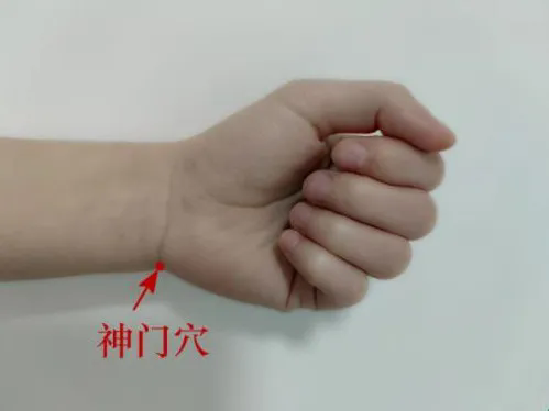 神门穴(位于腕部,腕掌侧横纹尺侧端,尺侧腕屈肌腱的桡侧凹陷处)