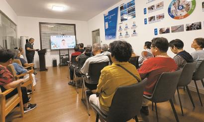 叶亚军在给店里的老年人播放健康讲座视频。 杨书源 摄