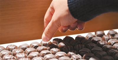 10月1日,在瑞士格吕耶尔地区布罗克的凯雅巧克力博物馆,参观者品尝巧克力。新华社记者 连 漪摄