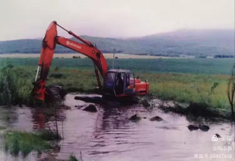 2012年元月初,时隔四十多年,当我再次来的双桥时,发现延绵十几里的水泡子湿地已变形了,山上的树林消失了,山坡变粮地了。当地已把水泡子的水源引到更低的地方造水库,于是乎湿地变稻田了,水草没有了,羊草没有了,水鸟没有了,水獭没有了……。下图为挖掘机在北兴农场七里嘎山下的湿地施工,图片来自《北兴农场志》。