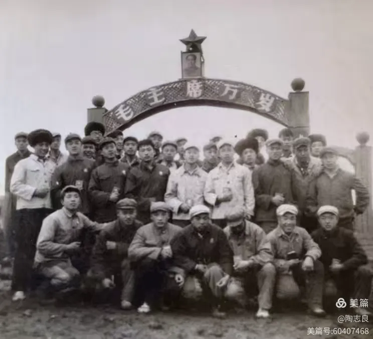 图为上世纪六十年代末6连部分北京、哈尔滨男知青和老职工在这个路口的留影。昔时的文革色彩十分浓郁。(图片由赵秋麟提供)