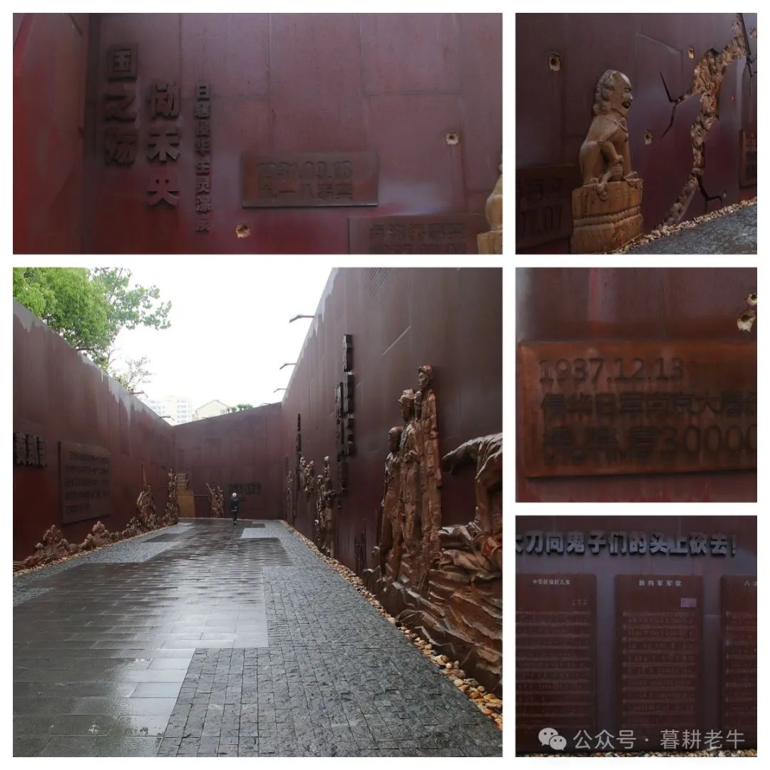 车到纪念馆,雨居然停了。雨后的纪念馆显得那么清新,显现出一派生机。我们随导游小倪进入纪念馆,迎接我们的是一长排由钢铁铸就的记载抗战重大事件的长廊,从“九一八事变”到“七七卢沟桥事变”,从“南京大屠杀”到“台儿庄战役”,直到“解放高邮古城”,纪念馆通过文字、浮雕等形式,在钢铁长廊上一一展现了这些重要的事件。展现的还有抗战中牺牲的国共两党的高级将领、抗日歌曲等,把一曲曲可歌可泣的中华民族不屈不挠的悲壮战歌奉献于我们的眼前。