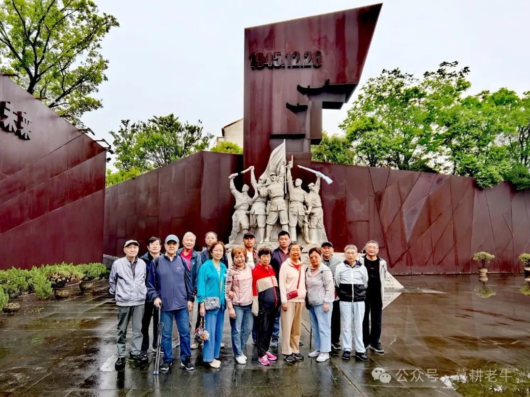 我们徜徉其中,心中时时升起对日寇的仇恨之情和对抗日军民的崇敬之感。大家在标有“1945.12.26”高邮侵华日军投降纪念雕塑群像和巨大党旗前留下了合影。