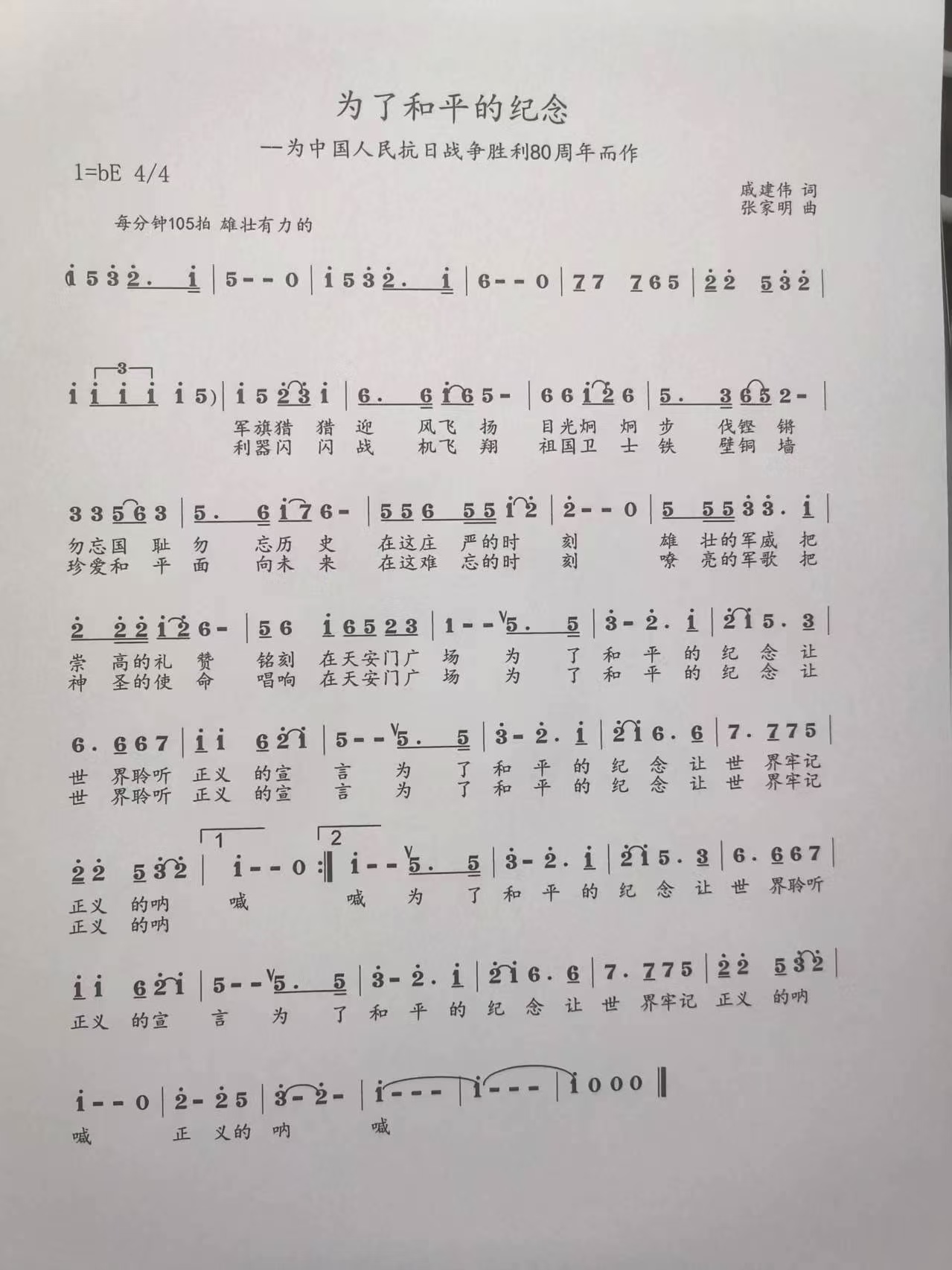 目光炯炯步伐铿锵 勿忘国耻勿忘历史 在这庄严的时刻 雄壮的军威 把最崇高的礼赞 铭刻在天安门广场 为了和平的纪念 让世界聆听正义的宣言 利器闪闪战机飞翔 祖国卫士铁壁铜墙 珍爱和平面向未来 在这难忘的时刻 嘹亮的军歌 把最神圣的使命 唱响在天安门广场 为了和平的纪念 让世界牢记正义的呐喊 为了和平的纪念 让世界聆听正义的宣言 为了和平的纪念 让世界牢记正义的呐喊 (责任编辑:铁滨) |