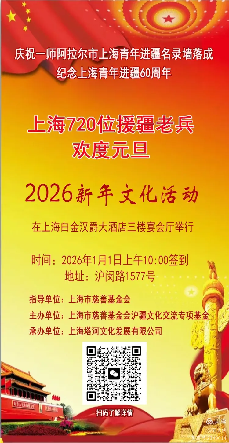 2026年元旦的钟声敲响,绵绵细雨也没有能阻止720名十万新疆知青的代表的脚步,一早就到了闵行五星级白金汉爵大酒店,齐聚一堂,约千余平米的宴会大厅,中无一根柱子,前面大舞台后面和边侧三面都是LED巨大的屏幕。