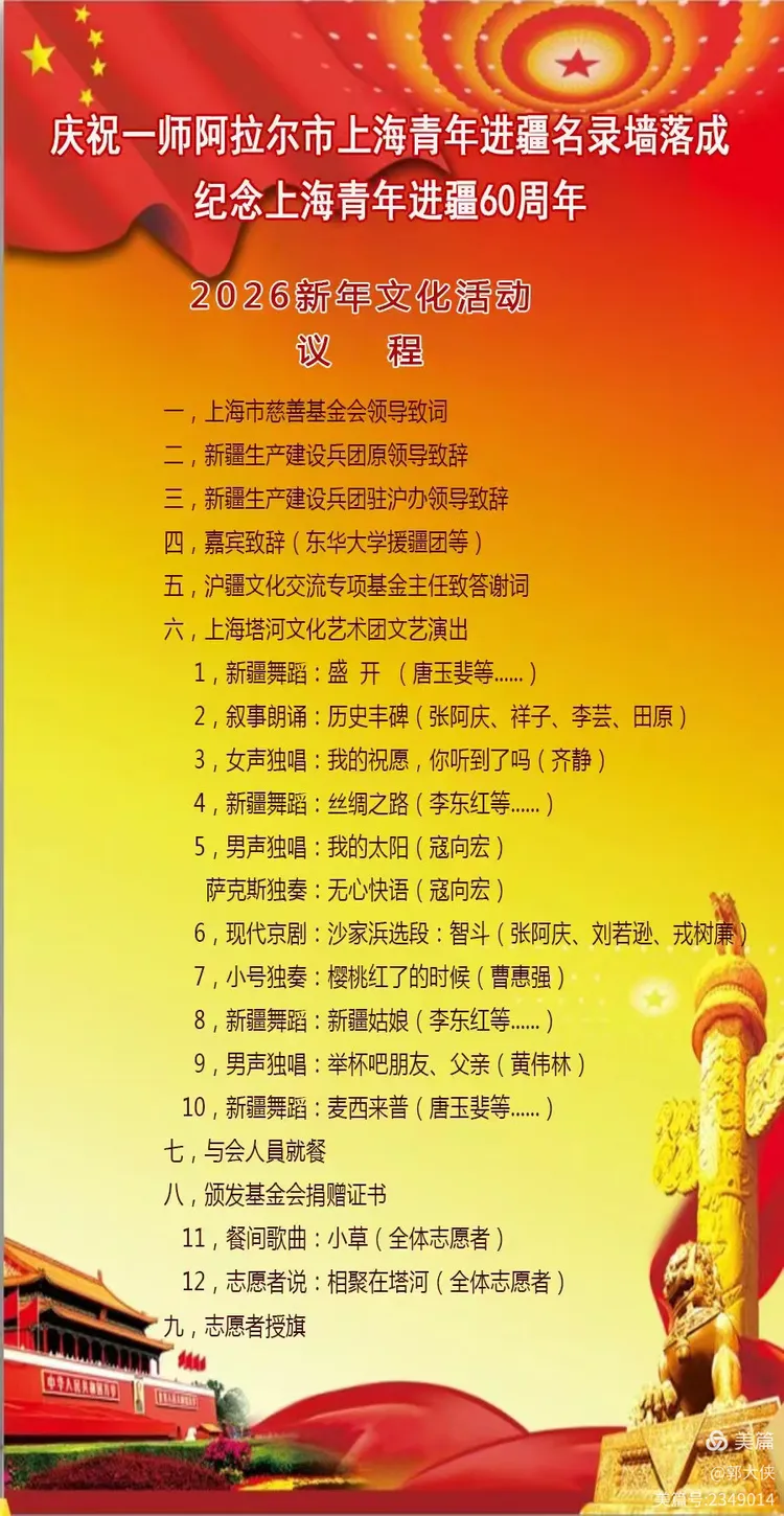 (责任编辑:铁滨)主办方“新疆塔河文化社”将在这里举办主题为“历史丰碑”纪念上海知青赴疆建设六十周年暨阿拉尔知青名录墙落成活动。 本次大会除了之前已经发行的“十万上海青年进疆名录”一书以外,当天发行“大漠红烛”一书。以及赠送“历史丰碑“纪念章人手一枚。 ![]() 会上,首先有塔河文化创始人企业家石振亮致欢迎词……出席本次活动的新疆老知青代表房地产企业家上海慈善基金会屠文超,原国家总工会副主席倪豪梅,原兵团副政委曹国琴,原塔里木大学副书记郑连真,原兵团统计局长沈炜珍,原兵团日报副总编丁言鸣,还有被称为“铸造大王”的民营企业家许发扬,还有原石河子上空永不消逝电波的发报员劳模赵兰英,原新疆第一个获得劳模称号的开大矿车女司机俞浣贞,原石河子卫生局副局长凌强,原兵团老一辈奠基者张仲瀚的侄孙张业新出席了现场活动…… 以及各师团的各级劳模,各级教师代表…… 特邀上海知识青年历史文化研究副会长张刚,李建炜副会长。“知青“杂志内刊主编,知青网站主编马琳,复旦大学社会学教授范伟达,内蒙古知青代表宁志超,上海知青杂志社总编王建国等嘉宾…… ![]() 一大批疆二代以“杨杨”“天涯“领衔的志愿者服务现场,他们大合唱“我和我的祖国”有郑连真代表老知青举行了志愿者授旗仪式。 演出节目主要有疆二代亚亚团队的舞蹈“飞天”和新疆舞麦西来甫的歌舞,还有歌手黄伟林的独唱,著名新疆知青艺术家田原担任总导演奉献了这台“历史丰碑”节目。塔河文化边疆文化摄制组在抖音网站直播了这场活动。 这是一场规模空前,具有历史意义的纪念大会…… ![]() ![]() ![]() 老知青向疆二代举行授旗接班仪式视频 疆二代亚亚团队舞蹈:丝绸之路视频 大厅门口 ![]() ![]() 亚亚团队集体照 ![]() ![]() 疆二代集体照 ![]() ![]() 郑校长和志愿者 ![]() ![]() ![]() 农一师杨海涵副师长,常年在阿拉尔,为知青林,知青名录墙建设,呕心沥血,老骥伏枥,无私奉献。 ![]() ![]() 张业新,张仲瀚侄儿 ![]() 中间为张业新,原石河子兵团医学院毕业,原上海江湾医院的检验科主任。 ![]() 倪豪梅 ![]() 倪豪梅,茅国升 ![]() 沈炜珍 ![]() 各团场纷纷合影 ![]() ![]() 疆二代:天涯 ![]() ![]() 劳模 ![]() 知青杂志主编:马琳 ![]() 知青研究会秘书长张刚,黑龙江知青,高博特公司总经理。 ![]() ![]() 宁志超 ![]() 阿凡提歌舞团老知青张利良 ![]() 原工三师21团知青工程师韩红生,曾经援助非洲埃塞俄比亚国家 ![]() 疆二代 ![]() 歌手黄伟林 ![]() 左起,张刚,郭大侠,乐工(农三师代表) ![]() (责任编辑:铁滨) |