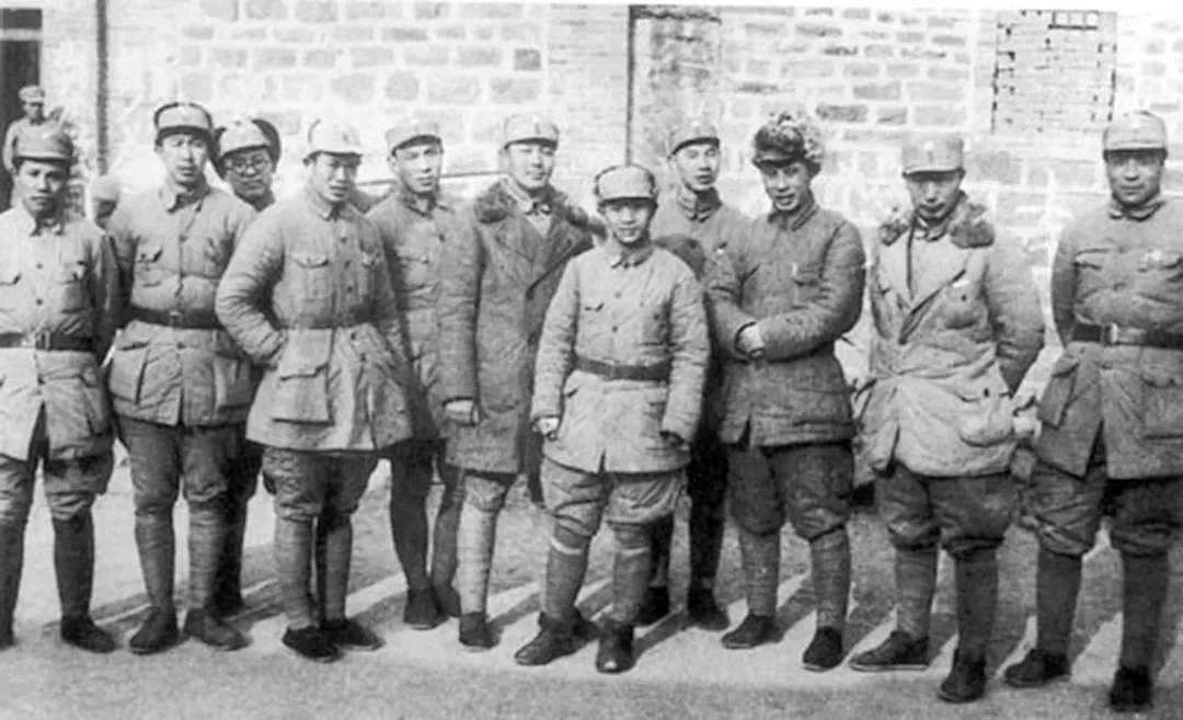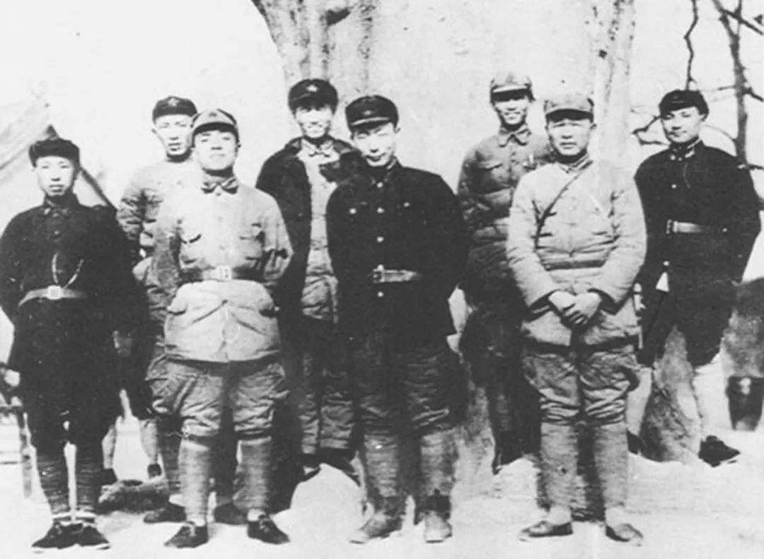 ◆1936年,红1军团、红15军团部分领导人在陕西合影。左起:王首道、罗瑞卿、杨尚昆、程子华、聂荣臻、陈光、徐海东、邓小平。