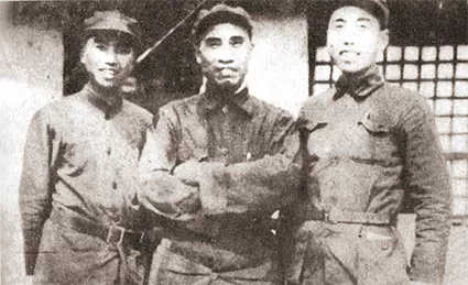 ◆1937年8月,红6军团与红32军改编为八路军120师359旅,朱德(中)与萧克(左)、王震(右)在延安合影。
