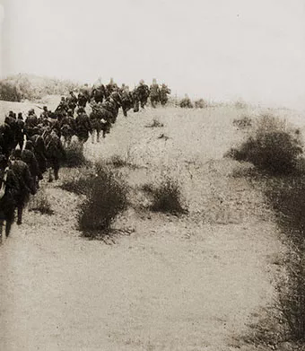 1949年11月底,5师刚刚抵达阿克苏,获悉国民党特务和民族分裂分子准备策划和田武装叛乱,师长徐国贤、政委李铨立即下令15团进军和田,挫败叛乱,稳定局势。当时从阿克苏到和田有三条路线:一条是沿迪(化)和(田)公路经喀什、莎车到和田,全长1100多公里;另一条是过巴楚顺叶尔羌河到莎车,再到和田,全长950多公里;第三条是从阿瓦提沿和田河干河床横穿塔克拉玛干大沙漠直奔和田,全长700多公里。为火速赶到和田,师决定15团走第三条路线。任务下达后,15团指战员们热血沸腾,纷纷表示只要能早日解放和田,就是“进得去出不来”的死亡之海也要闯一闯! 12月3日,15团团长蒋玉和、政治处主任刘月率小分队乘唯一的一辆车先行(3天后到达和田)。4日,当阿克苏各族群众得知15团要徒步穿越沙漠到和田,纷纷筹粮筹物,支援骆驼300多峰、马200匹、帐篷100多顶,并组织200余名民工将10余吨大米、20余吨面粉、几十吨草料和薪柴,将行军大部队护送到里克胡塔库,一些维吾尔族老猎人和商贩也争先报名给部队当向导。 12月5日,15团在政委黄诚、副团长贡子云率领下,1800余名指战员从阿克苏浩浩荡荡出发。6日中午到达阿瓦提,8日正式进入塔克拉玛干沿和田河干河床向和田方向挺进。冬季寒风刺骨,3天后在茫茫沙海缺水断炊,战士们用马尿湿润干裂的嘴唇,一到宿营地,便分头四处寻找水源。晚上睡觉时,狂风骤起,沙石铺天盖地,帐篷被风刮的无影无踪。12月15日,部队在塔克拉玛干沙漠中部行军时,遇到沙漠风暴,瞬间天昏地暗,飞沙走石,骆驼卧地哀吼不起,不少马和毛驴被惊跑,战士们手挽着手以免被风刮散,顽强地继续前进。黄昏时,部队顶着狂风飞沙来到两座大沙包下,遇到和田人民委派的代表170余人,从和田跋涉三四百公里到沙漠中部前来接应。他们送来了部队急需的补给,给15团全体指战员以极大鼓舞。 ![]()
