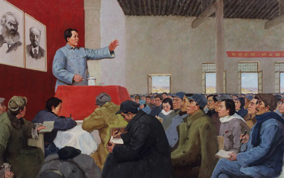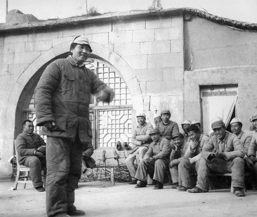 ◆毛泽东在王家坪军委大院给部队科技干部作整风报告。