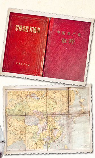 上图为刘毅留下的遗物,分别是党的七大、八大党章和从日军手中缴获的中国地图册内页地图。刘毅家人提供