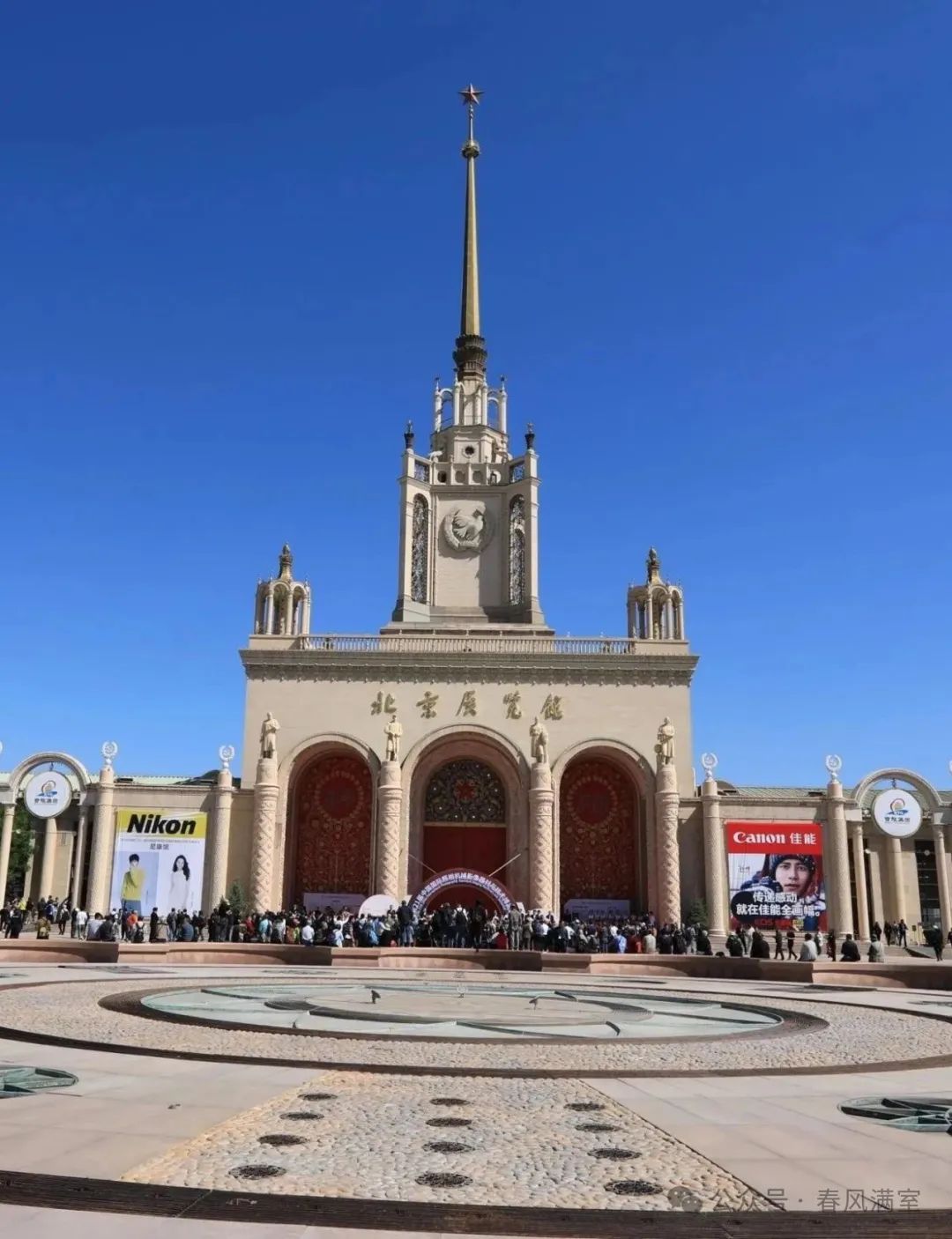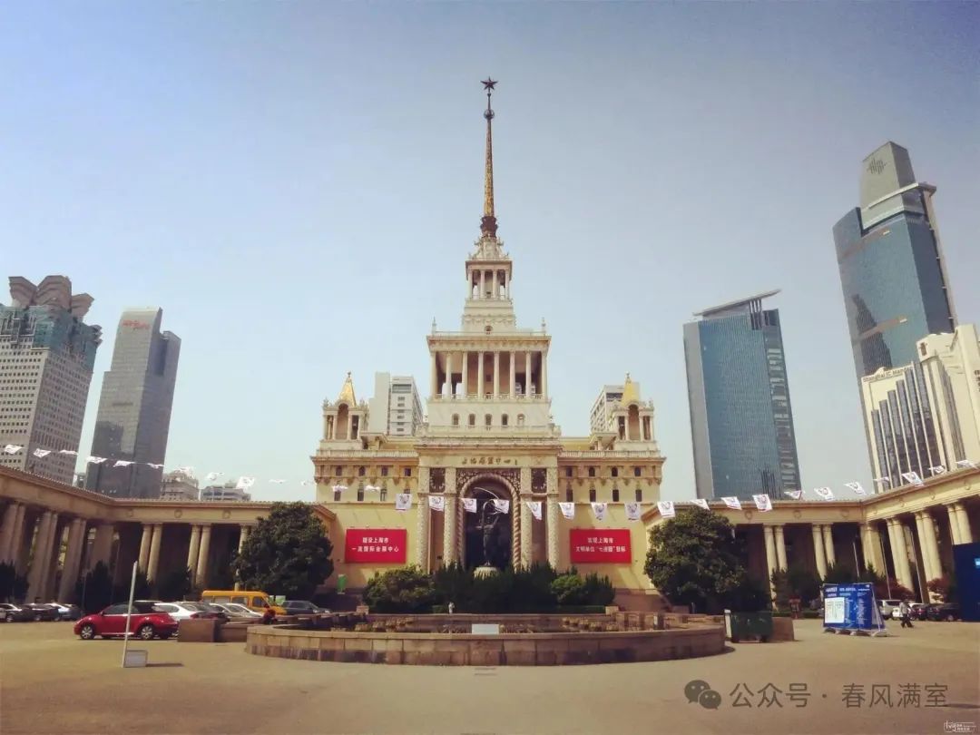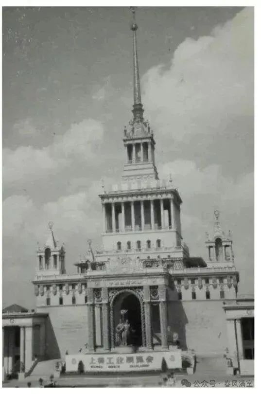 北京展览馆就这样,5月1日正式开工了。设计是这样,建设工期也只给10个月,以体现“社会主义高速度”。为了“抢时间,争速度”,施工采取平行流水和立体交叉相结合,在施工过程中创造高层移动脚手架等新技术,大大减少了搭固定脚手架的工时。在中央大厅基础工程中,为了省时间,干脆不打桩,用钢筋混凝土浇捣,制成长宽各45米,厚1米,高7米的大箱底,然后在此箱底上盖大厦。当时还没有振捣机,只能用钢钎手工捣实混凝土。这个箱型基础就是以三天两夜连续作战的方式“拼搏完成”的。大厦的“奇迹”还体现在中央大厅上空的镏金钢塔以及塔顶的红色五角星。塔顶离地114米,比当时上海最高的国际饭店还要高出20多米。这座钢塔由华东建筑机具修造厂承制,全长51.8米(包括红五角星及框架支座)。 整个塔身还用1300张0.7-0.8毫米厚的紫铜皮,压上花纹,包住塔身,然后在紫铜皮表面镏金,用去黄金300两,水银2400两。五角星用钢框架制成,镶嵌10毫米厚的红色玻璃,内装125只灯泡。总重32吨的钢塔和五角星,自中央大厅一次提升至高空,顶点与钢塔垂直中线偏斜仅5厘米,为总高度的千分之一,“完全合乎设计要求”。与北京的“十大建筑”施工类似,政府在正式施工的同时,也组织了大量义务劳动。就这样,在一个又一个“社会主义新奇迹”之后,“中苏友好大厦”于1955年3月15日正式对外开放。