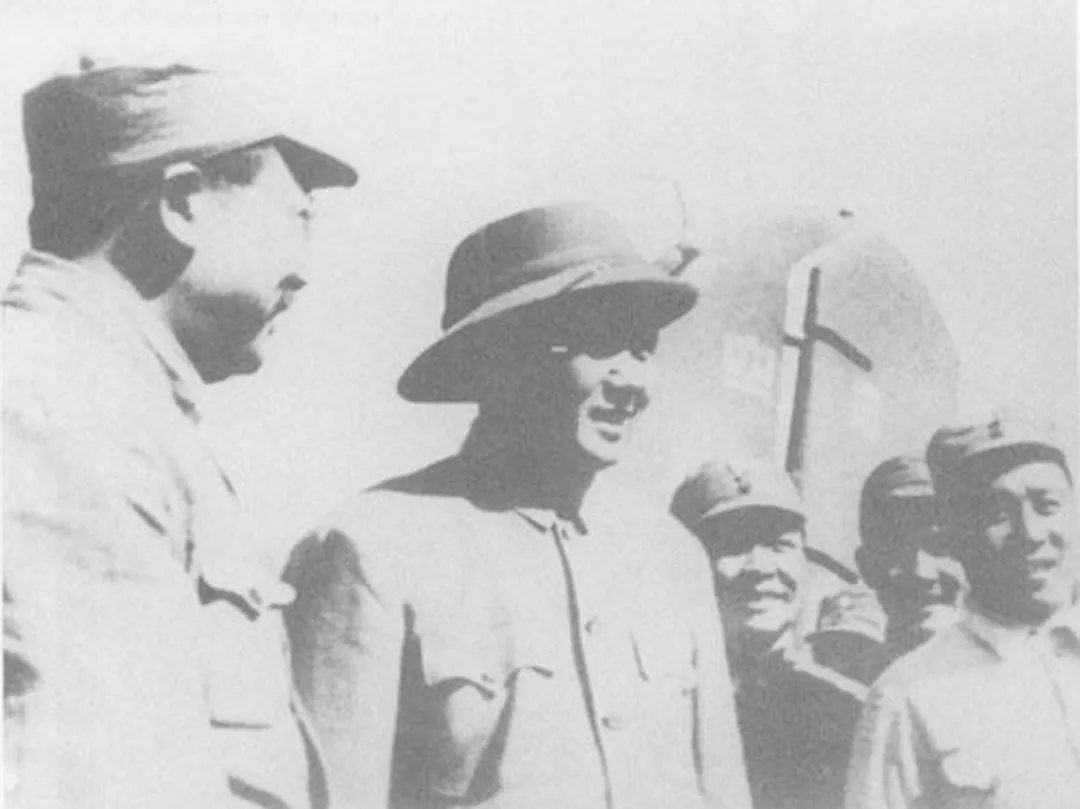 ◆1945年8月,李克农(左一)在延安机场为毛泽东赴重庆谈判送行。