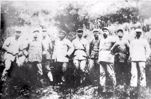 ◆1933年11月,第五次反“围剿”期间,叶剑英、杨尚昆、彭德怀、刘伯坚、张纯清、李克农、周恩来、滕代远、袁国平合影。