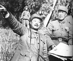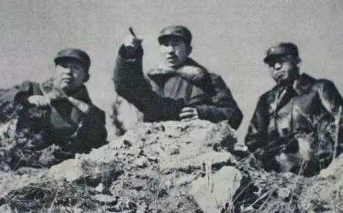 ◆罗荣桓(右一)、林彪(中)、刘亚楼(左一)在前线指挥。