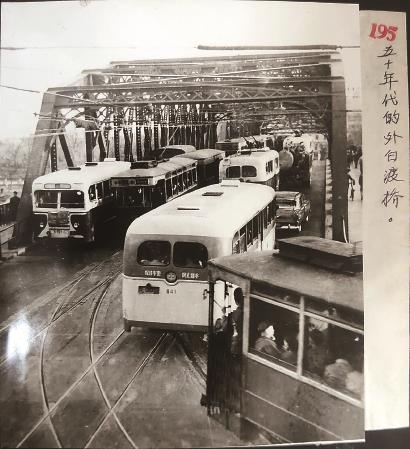 1958年 清晨载着上班工人的公交车、无轨电车、有轨电车,都要从外白渡桥上通过