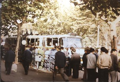 1980年 为了减少吊车现象,各线起终点站加装了“排队乘车栏杆”,图为20路中山公园终点站“排队乘车栏杆”