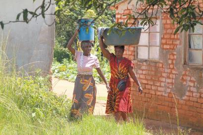 津巴布韦东马绍纳兰省两名女子头顶装水的容器。 新华社发