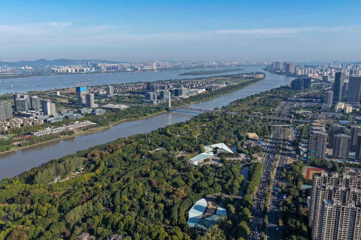 这是2025年11月18日拍摄的长江南京段滨江风光带(无人机照片)(新华社)