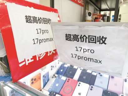 在环龙商场,多家店铺打出“高价回收”广告,但仅限新款手机。 任翀 摄