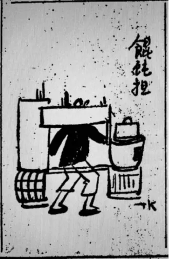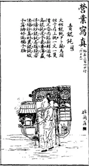西方人拍摄的这种“小吃摊”担子,实际上就是馄饨担。这张拍摄时间大约在1870年即同治九年前后。摄影师是一位英国人,在上海开了一家照相馆,其摄影的图片大多作为商业性质的买卖流通。【2】而在公众媒体上向西方人介绍上海“小吃摊”的是另一位名叫布莱克的英国人,他在1876年,从日本来上海办了一本《远东》的英文杂志,也是中国最早能刊登照片的杂志。该杂志在1877年的2月号上发表了一篇题为《流动的小吃摊》的短文,全文仅百余字,并配有一张流动小吃摊的图片: 流动小吃摊 在文明国家的大街上,随处可以看到一些卖小吃的小商贩。货摊、篮子、盘子、带有小火炉的锡罐、炉子、锅炉等工具应有尽有。但是,恐怕世界上再也找不到一种工具,比插图中展示的小吃摊更轻便、更合适了。无论是租界里清朝人聚居的区域还是大大小小的清朝城镇,图中的竹器随处可见。小吃摊前顾客络绎不绝,摊主们肯定获利不菲。这些竹器编织得很精致,还装有必要的加热装置。加热装置有些是由烧制的泥土制成,有些是由铁制成,并不局限于一种材料。【3】 ![]() 这是馄饨小吃摊在公众媒体上的首次亮相,图片比较完整地展示了穿梭在街头弄堂里竹编馄饨担的独特造型。担子的前面是炉灶,即洋人眼中的“加热装置”,炉灶上是锅子。后头是放馄饨皮子及馅料的几层抽屉。炉灶和抽屉下面相对有一个弧形空间,分别盛放柴爿及水桶。担子上方是竹编镂空纹饰的横阁,用来放置各种佐料及碗匙瓶罐等家什。肩就挑在横阁下面一根呈拱形的扁担上,扁担前悬吊着一杆开着长长口子的竹梆子,走街串巷以“卜卜卜”的梆子声替代了挑担人的叫卖声,招来食客们的络绎不绝。 这副担子的巧思,在于聪慧的手艺人吸收了其他小吃担子的基本元素,将平民百姓家灶间厨房中具有实用功能的灶炉、碗橱等物件,通过独具匠心的设计,以精巧的手艺用竹编织成担子上各个不同部位的构件,然后进行组合,呈现在人们眼前的是一副精致而又具有观赏性的馄饨担子。它的造型类似马头,故称“马头担”,江南一带亦以其形如驼峰而谓之“骆驼担”。 1909年(宣统元年),《图画日报》第34期上有沪上名画师孙继(兰荪)手绘的一幅风俗画《卖馄饨》: ![]() 图中配有民谣一首: 大梆馄饨卜卜敲, 马头担子肩上挑。 一文一只价不贵, 肉馅新鲜滋味高。 馄饨皮子最要薄, 赢得绉纱馄饨名蹊跷。 若使绉纱真好裹馄饨, 缎子宁绸好做团子糕。【4】 从现存的文献记载看,“马头担”较早的出处大概就是这幅《卖馄饨》了。“绉纱馄饨”,是当时的一款猪肉馅小馄饨,一文钱一只。民国初,供职于商务印书馆的徐珂编撰完成的《清稗类抄》有解释说:“以薄面为皮,有襞积,人呼之曰绉纱馄饨,取其形似也。” 皮薄如纱且呈折纹叠积形状,就是“绉纱馄饨”的由来。 1914年,上海扫叶山房印行的《最新滑稽杂志》以《三百六十行营业谣》为题,辑录了流行的各行各业民谣约255首,《卖馄饨》这首民谣亦收录其中。