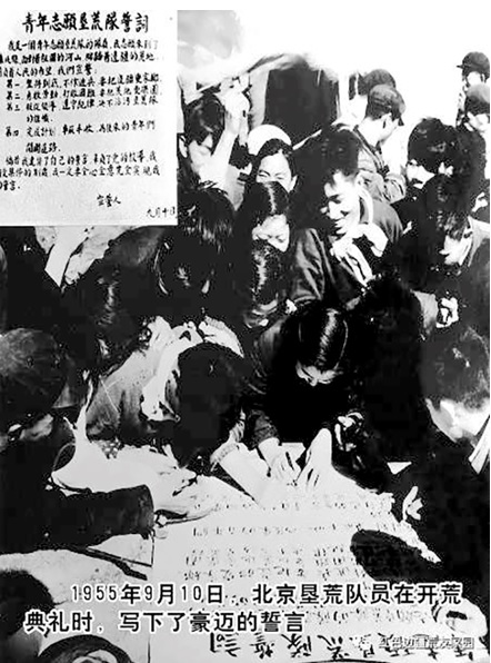 1955年9月10日,在人迹罕至的萝北荒原,垦荒队举行了简单而又隆重的开荒仪式。他们面对茫茫荒野,站在高高飘扬的垦荒大旗下,庄严地举起了右手:“我是一个青年垦荒队的队员,我志愿来到萝北县,面对祖国的河山,脚踏着边疆的荒地,肩负着人民的希望。我们宣誓:第一,坚持到底,不作逃兵,要把边疆作家乡。第二,勇敢劳动,打败困难,要把荒地变成乐园。第三,服从领导,遵守纪律,决不玷污垦荒队的旗帜。第四,完成计划,争取丰收,为后来的青年们开辟道路。”中共萝北县委书记阮永胜亲自在仪式上剪了彩。随着队长杨华的一声令下,四台套着六匹马的垦荒大犁,在千年沉睡的荒原上翻起了一层层黑色的泥浪,碧绿的草原变成了黑褐色的良田。
