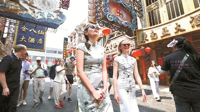 外国游客在上海影视乐园黄河路片区沉浸式感受影视剧中的“烟火上海”。松江区融媒体中心供图