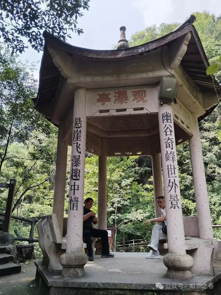 双生秘境 8月3日8点,因朋友相约并由他驾车奔赴金华。车轮碾过晨曦微光,城市的高楼被我们决然抛在身后,一心向着山水深处。 车停磐安,水下孔景区在望。沿山道徐行,脚下溪流淙淙,清亮得能映出人影。拐过山壁,竟遇一挂飞瀑,自高高的崖顶轰然垂落,水势如雷,碎玉喷溅,扑面而来的水雾裹挟着沁骨的凉意,瞬间驱散了跋涉的燥热。小满忙着拍照,却被水雾喷得哇哇乱叫,我们相视大笑,笑声在震耳水声里显得格外渺小,却又格外真切。那清凉的水汽直透肺腑,仿佛连灵魂里的尘埃都被冲洗干净。
