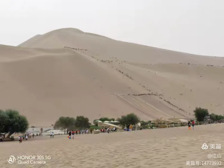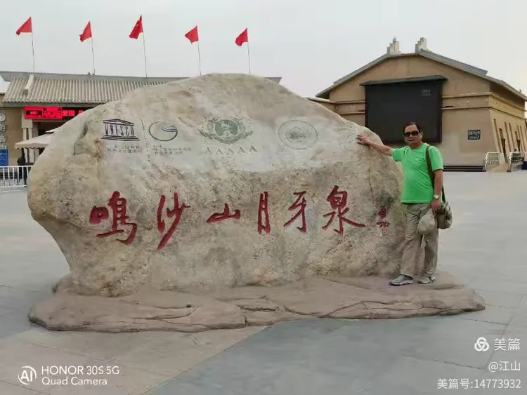 就在即将到达敦煌市时,突然漫天飞舞着风沙,能见度只有十米,感觉就是沙尘暴。我在心中默默祈祷老天爷,千万不要在我们到景点时风沙依旧不停,那就白来了一趟。好在穿过市区来到鸣沙山月牙泉时,风沙停了,仿佛老天爷在眷顾我们这些远道而来的游客。后来听说,那个地方是一个风口,经常风沙弥漫。 虽然已经傍晚六点了(此地晚上九点半才天黑),景区依旧人满为患,放眼望去,沙山上密密麻麻的游客就像蚂蚁一样,骑骆驼的游客一大串行进在沙漠里,像一条长龙蜿蜒,真是巨龙见首不见尾,据说光骆驼就有上千匹。 本人因为曾经在内蒙旅游时骑过骆驼,感觉并不很爽,所以不骑骆驼,与同伴一起去寻找月牙泉“洗心”。神奇的月牙泉像一弯新月静静地俯卧在鸣沙山麓,清澈温顺,水似柔情。其实每一个来到这里的游客,必定是为她而来。骑骆驼,登山,滑沙,甚至乘坐直升机观光,都是为了一睹月牙泉的真容。因为在这干旱高温的沙漠中能够千百年保持着这样的一弯清泉,实为罕见,因为大风是从沙山脚下往上吹,所以月牙泉永远也不会被风沙埋没,这也是造物主的匠心之作。 沙泉与共,山水相偎。真不愧为塞上明珠,西域奇观。我们与鸣沙山共舞,与月牙泉对语,扬一把飞沙,捧一掬清泉,三生有幸也!