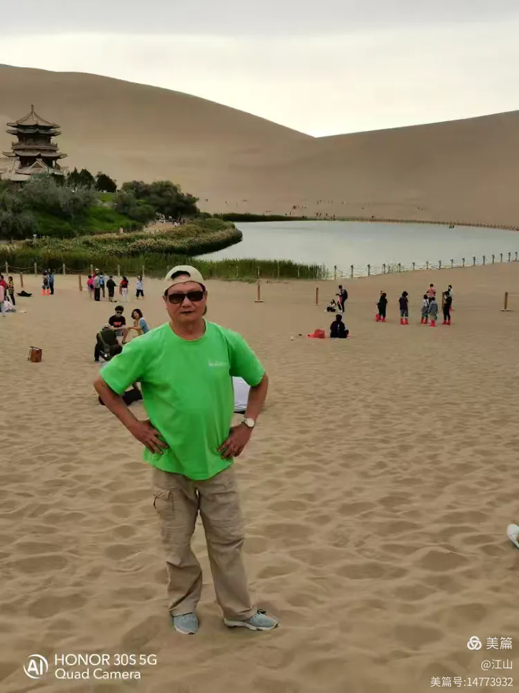 早晨六点钟从青海德令哈出发,下午六点钟到达甘肃敦煌的“鸣沙山.月牙泉”景点,560多公里整整走了12小时,其中在大柴旦翡翠湖浏览了一个多小时,除去午餐时间,路上将近坐车10小时(车辆限速),每一个人都精疲力竭,但是到了向往的山水之地,总归还是打起精神来参观的。