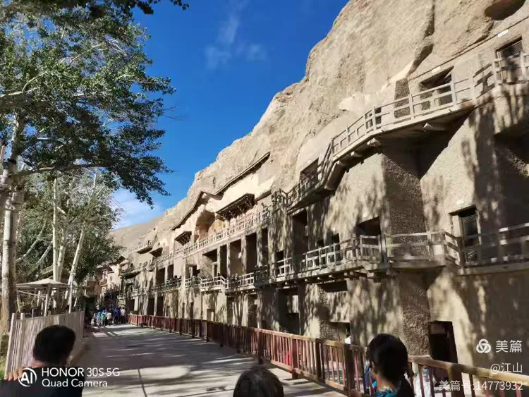 今天来到名扬中外的莫高窟,真得被震撼。我们购买的是A票,首先进影院观看两场电影,一场是大型宽银幕彩色影片《千年莫高》,讲叙的是莫高窟千年历史,大漠烽烟,丝路花雨,场景宏观,立体音响效果特别好,将观众带入其中,具有身临其境之感。第二场则是环球立体影片《梦回佛都》,放映的是莫高窟里面的画像,运用现代高科技手段,将莫高窟精彩壁画和佛像真实的再现在观众面前。 进行完了“学前教育”,再来到莫高窟现场,加上专业导游的讲解,让游客直观的感受《千年莫高》的前世今生,仿若《梦回佛都》,走进莫高窟。 经过导游小姐的详细介绍,让我们了解到了莫高窟与别的洞窟有着不一样的内涵。河南洛阳龙门石窟,山西大同云岗石窟,甘肃天水麦积山石窟里面的佛像均为石雕,而莫高窟里面的佛像则为泥塑,所以本质有所不同。另外,其它三个石窟属于官方规划,施工,管理,而莫高窟却是家族挖掘建造,以其家族地位财力高下决定洞窟大小,装饰繁简而为,该洞窟实际上属于家庙性质供家族人员拜祭,所以莫高窟里面的洞窟大小不一,佛像壁画各异,掘造时间不同,两千年来各朝代都有,官方不予涉及,纯属私家所有。当然现在已经收归国有,统一管理,维修,保护,原来的连梁楼道都是木制结构,历经千年风雨,早就破败不堪,如今已经用钢筋水泥加固,墙面喷涂水泥砂浆,洞口安装铝合金门窗。 莫高窟里面的壁画内容以唐宋元明清各朝代的文化形式展现在游人面前,所以它们各具特色,各展风采。为了保护这些珍贵的文化遗产,众多洞窟分散轮流开放,景区安排A票游客可以参观八个洞窟,B票游客只能参观四个洞窟,显然票价是不同的,这也是为了限流游人,保护遗产。 回到敦煌市区用过午餐,我们又马不停蹄的赶往万里长城第一关——嘉峪关。经过五个小时的高速公路,傍晚六时来到了嘉峪关。 嘉峪关保存完好,高耸的城墙,飞檐的楼台,厚重的城门,漆黑的火炮,楼台梁柱显现历史沧桑感的朱红色油漆,让游客一看就知道这个关隘是原版的,绝非仿古建筑。 但是除了城楼雄关,却不见有长城相连,问导游为何不见城墙的踪影,导游也王顾左右而言他的回答我,终于我在下面发现一小段土墙,上面写有“明长城遗址”说明。 曾经爬过北京八达岭的长城,今天来到了万里长城第一关的嘉峪关,希望能在有生之年去看看山海关的老龙头,那就完美了,无憾了!