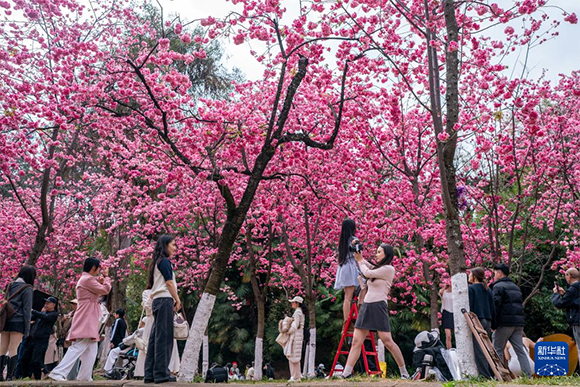 近日,云南昆明圆通山公园的樱花进入盛花期,吸引众多市民游客前来踏青赏花,感受春天的气息。新华社记者 胡超 摄 ![]()