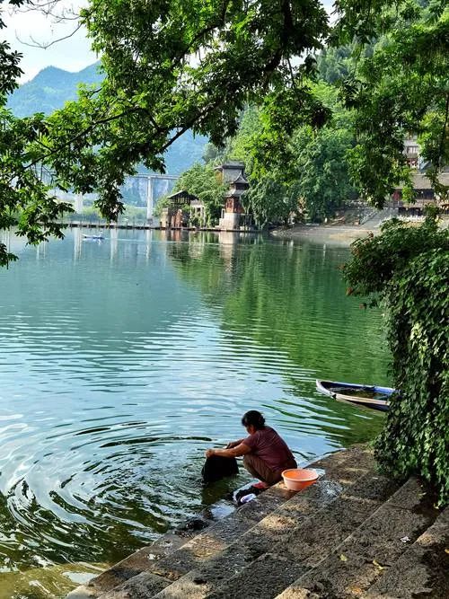 这里,城垣逶迤,河水悠悠,吊脚楼古色古香,古朴民风尚存,穿流三省的清水江依然碧绿,载着游客的小篷船来回穿梭。意外的惊喜,来自茶峒与洪安之间那摇啊摇的古老拉拉渡船,坐上去,一下子便把人拉回了久远的时光……