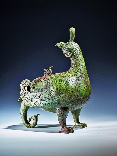 走进山西博物院展厅,鸟尊凤鸟伫立回首的造型最为引人注目:凤鸟头微昂,尖喙上扬,圆睛凝视,高冠直立,一副卓然于世的神态。鸟背上栖立着一只小鸟,大鸟回眸守护,小鸟孺慕依偎。这小鸟也是打开器盖的盖钮。凤尾下,一巨象缩首,象鼻内卷而上扬,与凤鸟硕壮的双腿形成稳定的三点支撑,体现了古人的设计巧思。