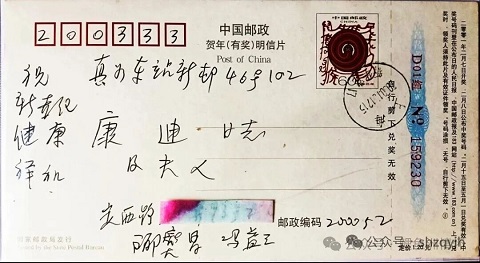 冯益三(1925.3.10-2020.7.12)江苏省涟水人。原上海生物制品研究所培养基室副主任、党支部书记;生物制品学校党支部书记。1945年8月参加革命,任新四军三师十旅休养所护士。1983年12月离休,享副局级待遇。 丈夫郦燮昌(1921.2.19-2015.12.31)江苏省丹阳人,原上海生物制品研究所所长、党委书记、高级经济师、享受局级待遇离休干部。1938年参加革命,1939年入党。1946年任新四军干部工作队队长。1949年任华东军政委员会文教委员会调研室主任。 【邮品】中国邮政2001年贺年(有奖)明信片,2000.12.12.上海新华路邮局日戳;背面投递戳不清。
