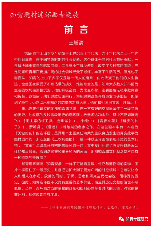 ![]() 前 言王增清 “知识青年上山下乡”初始于二十世纪五十年代末、六十年代末,至七十年代中达到高峰,是中国特殊时期的社会现象。这个群体于当时社会有所贡献,一是解决城市青年的吃饭问题;二是宿小了城乡差别,改变了乡村落后面貌;三是使知识青年在更加广阔的社会领域经受了锻炼,丰富了生活阅历。但是也不容否认,知青的上山下乡不仅是这一代人的磨难,由此改变了他们的人生轨迹,也使国家蒙受了不可估量的损失,难能可贵的是,知青大多数人并不因为生活的坎坷而消极沉沦,他们积极奋发,为改变农村、边疆面貌无私奉献青春和智慧;返城后,他们继续负重前行,为新时期改革开放事业添砖加瓦;即使到了晚年,仍然以乐观豁达的态度来对待人生,他们和祖国同甘苦,共命运! 朱小杰先生建立的湖州知青博物馆,在一方有限的空间里留住了一段特殊的历史。他收藏的反映这段历史的连环画,数量多达70余种,其中不乏如陈逸飞(《毛主席的红卫兵—金训华》)、徐纯中(《青春火花》《延安的种子》)、罗希贤(《雪莲》)等绘制的名家之作。在这些画本中有一本名为《关键时刻》的连环画,是湖州本土画家任海荣先生以身边发生的真实故事为题材创作的;还有一种浙江版的《工农兵画报》,是一种以连环画为表现形式的艺术刊物,“文革”至改革开放初期曾经风靡一时,其中专门刊登了原吴兴县新溪公社的知青故事。看到这些曾经亲身经历的画面,湖州知青和其他观众是不是有一种特别的亲近感? 知青连环画与“知青现象”一样不可能再重版,但它与博物馆的实物、图片一样留住了一段历史,它扩大到了更为广阔的时空领域;它可以让今人和后人在参观、欣赏的同时,了解、思考和研究当代社会这一段特殊的历史。因此,知青连环画不仅具有重要的艺术价值,而且其历史文献价值也不可低估。当然,连环画对当时事物的颂扬和批判必然带着时代的印痕,对它的是非评判,相信读者自有度量。 注:前言作者王增清,1950年10月生,浙江海宁人,曾是知青,大学文化,湖州师范学院图书馆馆长、研究馆员。 ![]() ![]() ![]() ![]() ![]() ![]() (晓歌 编辑) (责任编辑:晓歌) |