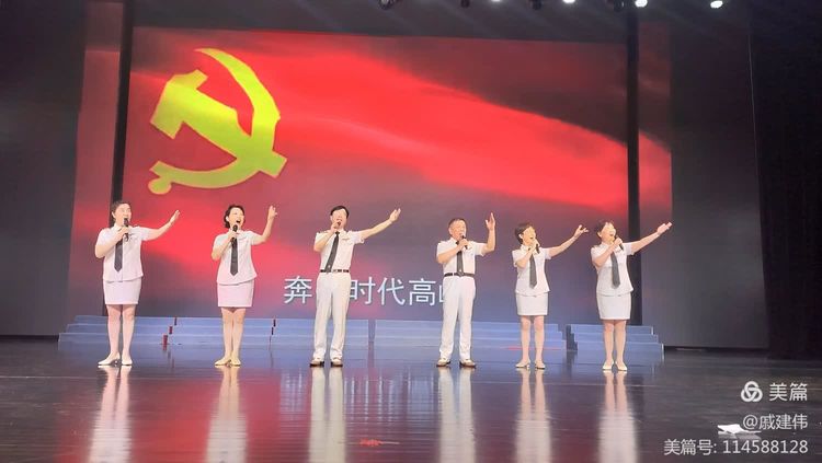 由启东市老科大海韵艺术团表演的小合唱《弹起我心爱的土琵琶》、《党旗飘飘》,弦音轻拨,歌声唱出了铁道游击队的传奇色彩;唱出了“跟党走”的坚定,从抗战时的救亡图存,到如今的强国建设,党旗始终是指引方向的一道灿烂的霞光。