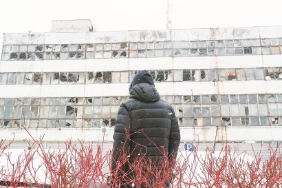 1月9日,一男子在乌克兰首都基辅市第聂伯区查看空袭中受损的建筑。