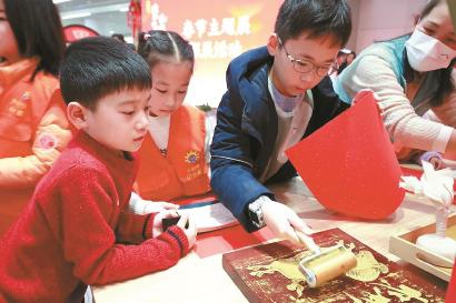 上海社会科学馆春节主题展沉浸式还原老上海年俗场景。图为孩子们在现场体验“年画拓印”,通过亲手制作重拾地道的上海年味。