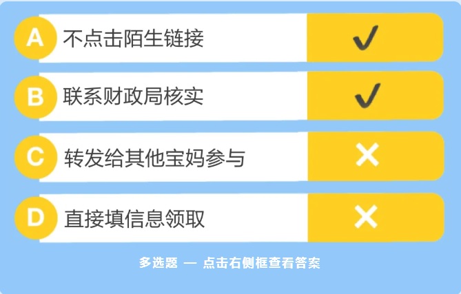 您认为如果收到“财政局发育儿补贴,点击链接领取”的短信,里面有一个领取链接,应该怎么做? ![]()