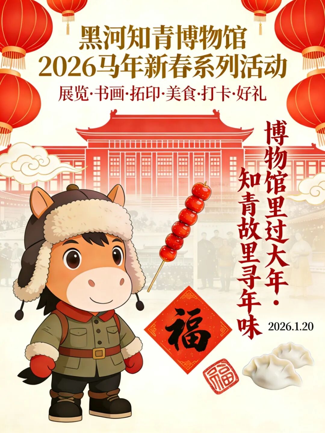 ![]() 博物馆里过大年 知青故里寻年味 博物馆里过大年|赴知青故里之约,解锁新春限定年味! 新年快乐! 博物馆过大年 新春的脚步悄然临近,年味在烟火气中愈发浓郁~ 2026 年 1 月 20 日,黑河知青博物馆 “博物馆里过大年・知青故里寻年味” 系列活动即将温情启幕!当知青岁月的热血芳华遇上传统年俗的喜庆热闹,一场集文化体验、互动创作、美食共享于一体的新春盛宴,正邀全市市民、青少年群体、知青及家属、游客共赴美好之约,在博物馆里邂逅别样团圆! 活动安排 活动时间:2026年1月20日 活动地点:国家方志馆知青分馆展示中心影视大厅 主题展览 走进临时展厅的《同样的青春 —— 不同时代青年典型人物事迹展》,带大家重温不同时代青年的奋斗故事。那些镌刻在岁月里的坚守与热血,将在新春氛围中焕发新的光彩,让参观者在文化浸润中汲取奋进力量。 年味儿书画创作 笔墨飘香忆芳华!我们邀请了书法家、画家现场挥毫,围绕知青岁月、青春奋斗、新春祝语等主题创作。感兴趣的观众也可自主创作,老师会巡回指导,助力大家写出满意的作品。活动结束后,大家可领取自己的创作成果,把满满的年味与回忆带回家。 马年拍照打卡 活动现场特设马年主题拍照打卡装饰墙!彩色的灯笼树、吉祥的马年元素,打造出氛围感十足的打卡点。大家可在参与各环节活动间隙,与家人朋友在此合影留念,定格马年新春的欢乐瞬间,记录美好回忆。 拓印体验活动 超有趣的拓印体验来啦!在指定区域,大家可亲手拓印福字、制作中国结挂饰,感受传统手工艺的魅力。工作人员会提前讲解拓印步骤与安全注意事项,全程提供指导,新手也能轻松上手。完成后可直接领取自己亲手制作的拓印福字和中国结挂饰,把专属新春祝福带回家。 岁月美食品鉴 逛累了,就来油画馆二楼共享美食!这里为大家准备了面团、猪肉馅等新鲜食材,还有齐全的厨具与干净的围裙、厨帽、一次性口罩。大家可集体参与饺子包制,在欢声笑语中体验动手的乐趣,工作人员会全程指导技巧,还会将包好的饺子统一煮熟。随后,大家围坐一堂,品鉴热气腾腾的饺子,在舌尖的鲜香中感受知青岁月的烟火气与新春的团圆味。 参与方式