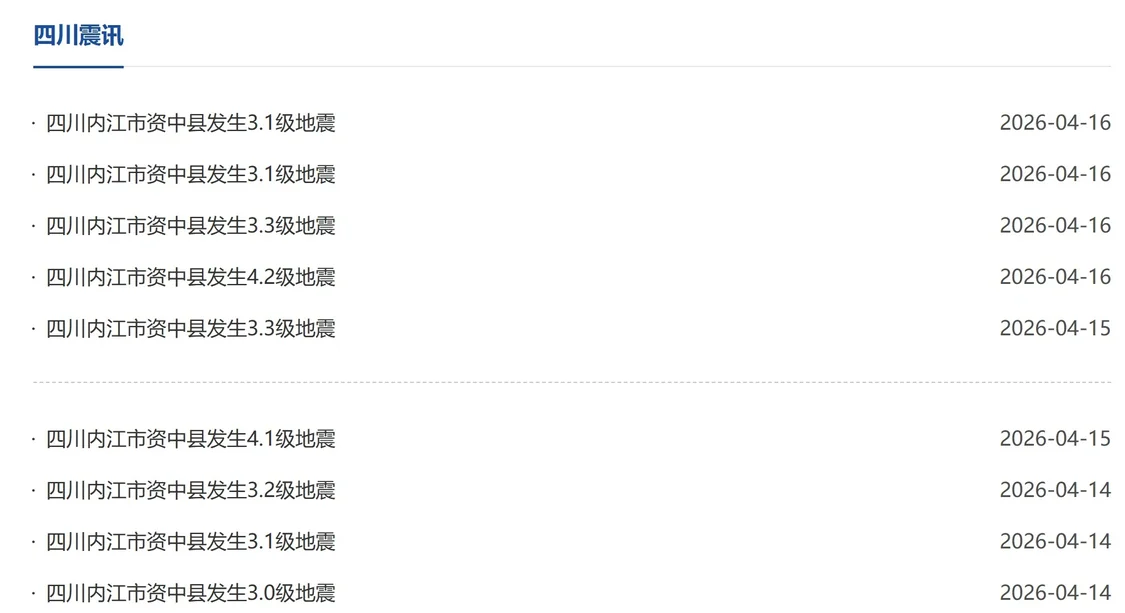 近期四川境内发生的地震。图/四川省地震局 4月16日下午,九派新闻联系到四川省应急管理厅地震与地质灾害救援处,一位工作人员表示,目前应急管理厅的工作组已赶赴内江市资中县的地震现场指导工作,暂未收到有关人员伤亡及财产损失的报告。“应急管理厅主要负责地震救援,地震的具体成因、监测预警或预测研判主要根据地震局的分析结果,以他们的消息为准。” 而后,四川省地震局一位工作人员告诉九派新闻,目前地震局的专家已在会商和研判,暂不清楚地震原因,后续将在四川省地震局官网及微信公众号发布官方消息。 据中国地震局官网,地震发生后,中国地震局迅速启动四级应急服务响应,调度中国地震台网中心、四川省地震局开展应急处置,要求有关单位开展联合会商,加强震情监测和震后趋势研判,及时报告有关情况。 据内江市人民政府新闻办公室,截至4月14日18时,资中县未发现人员受伤,无房屋倒塌或基础设施受损情况,供水、供电、供气及通信网络均保持正常,应急救灾物资储备充足,民众生活未受影响。 为什么会连续发生这么多起地震?这是否为大震来临的先兆?据人民网报道,中国地震灾害防御中心正高级工程师刘华国表示,震中附近目前没有已查明的活动断层,这几次的小型地震可能是由于周边褶皱发育过程中应力局部调整所带来的,所以震级不高,但是会有震感。结合地震发生的构造位置判断,该地区发生大震的可能性不大,民众无需恐慌。 刘华国提醒,因为地震时局部会有震感,民众也需要注意防灾避险。在家中要注意放在高处的物品、吊灯、吊扇等因楼体晃动坠落,以免被砸伤。外出时一旦收到地震预警,因为有些高层建筑可能会产生晃动,要远离可能有高空坠物的区域,尽快前往空旷地区,防止出现意外伤害。 他也呼吁大家,开启手机地震预警功能,或者关注中国地震台网的相关预警平台,以便及时做好避险准备,减少因地震带来的损失和伤害。 九派新闻记者 代梦颖 编辑 任卓 李杨