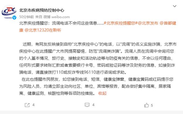 北京市疾控中心提醒:警惕以“流调”名义实施的诈骗