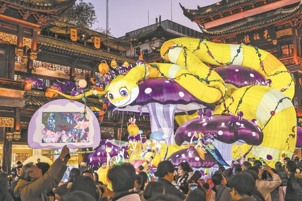 中心广场呈现“天地人和,金蛇献瑞”的热闹丛林景象,金色灵蛇盘绕在蘑菇丛林中,灵蛇的身躯仿佛一道流动的彩带。 均本报记者 袁婧摄
