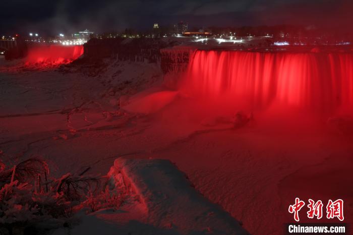 当地时间1月29日,农历乙巳蛇年大年初一,加拿大著名旅游景点尼亚加拉大瀑布在晚间用灯光点亮“中国红”,庆祝中国春节。 中新社记者 余瑞冬 摄