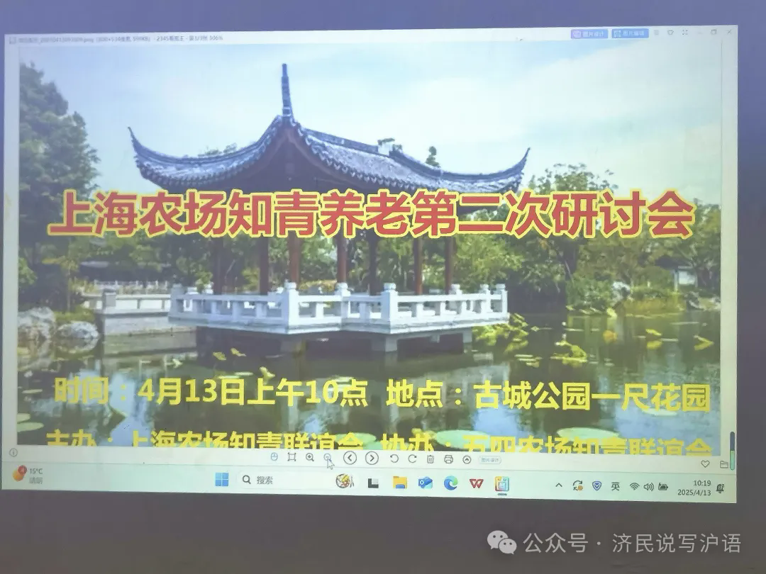 4月13日,上海农场知青联谊会主办的第二次养老研讨会在上海古城公园内胡问遂艺术馆举行。会议由联谊会名誉会长吴树鸿主持,俞荣斐顾问出席,19位农场知青参加研讨。