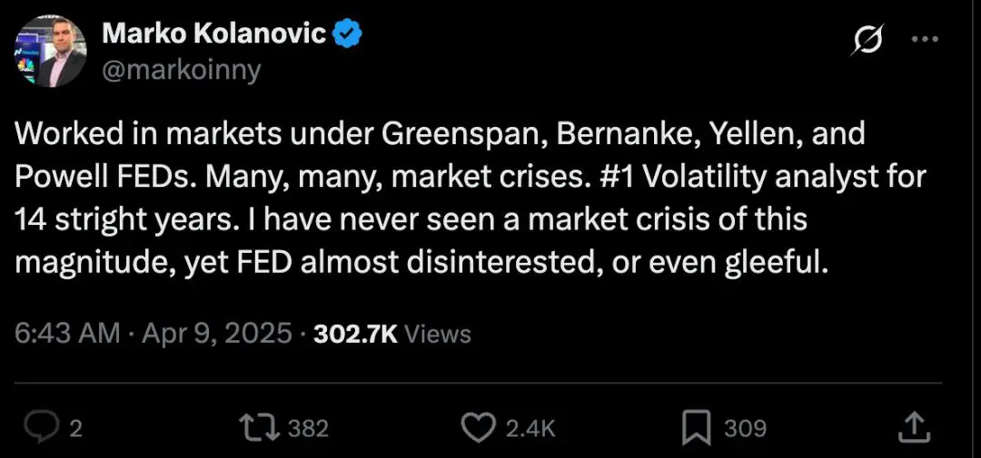 曾在格林斯潘、伯南克、耶伦和鲍威尔多位美联储主席领导下的市场工作,经历过许多市场危机,连续14年排名第一的华尔街波动性分析师Marko Kolanovic在4月9日表示:“我从未见过如此规模的市场危机,而美联储却几乎无动于衷,甚至幸灾乐祸”。