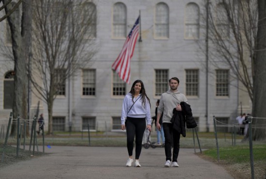 4月15日,人们漫步在美国马萨诸塞州剑桥市的哈佛大学校园内。新华社/路透