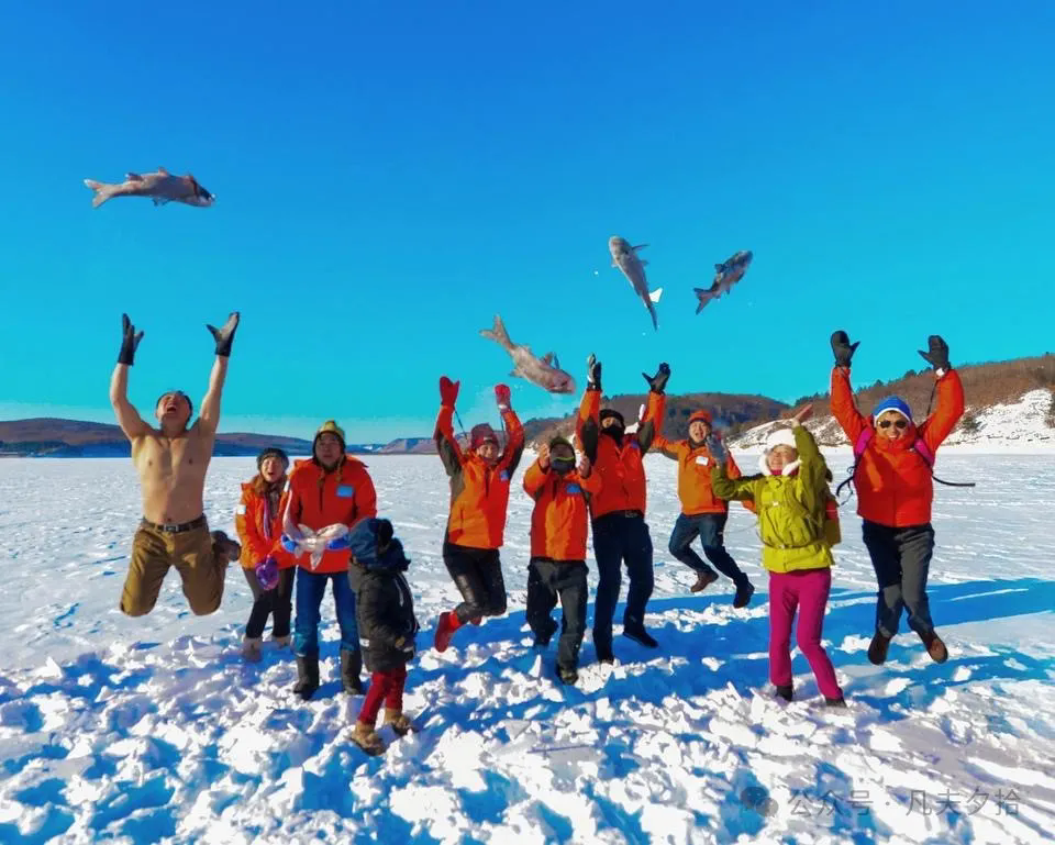 当一条条鲜活的花鲢、白鲢从冰孔中被网拉出时,亲历冰上冬捕的我们,激动之中一个个把捕获的鱼儿都抛向了空中。随即,这些冬捕的鱼被烹制成了美味的鱼宴,中午又被我们大快朵颐……