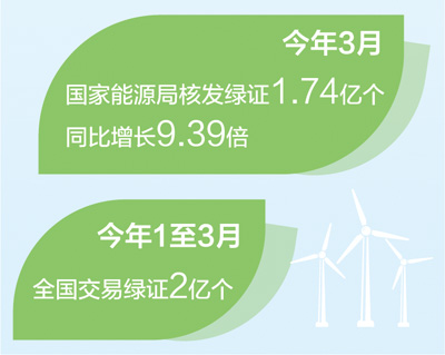 今年3月,国家能源局核发绿证1.74亿个,同比增长9.39倍;1至3月,全国交易绿证2亿个。绿电生产规模不断扩张,绿电绿证消费也在蓬勃发展。